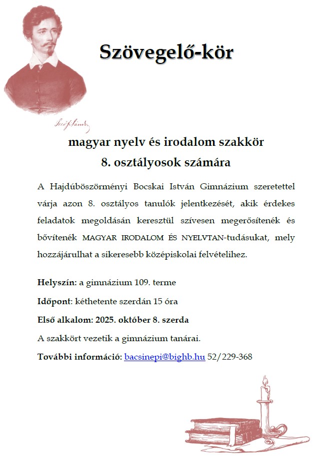 A Hajdúböszörményi Bocskai István Gimnázium szeretettel várja azon 8. osztályos tanulók jelentkezését, akik érdekes feladatok megoldásán keresztül szívesen megerősítenék és bővítenék MAGYAR IRODALOM ÉS NYELVTAN-tudásukat, mely hozzájárulhat a sikeresebb középiskolai felvételihez.